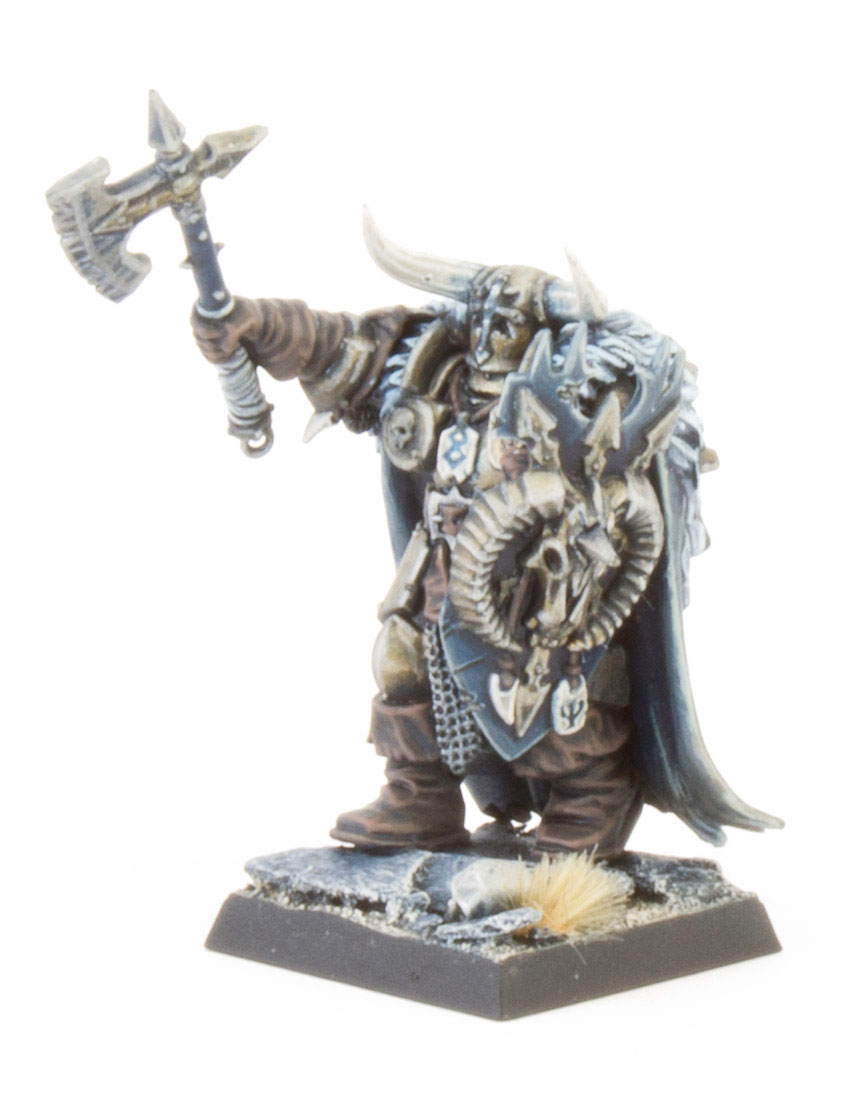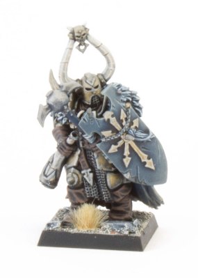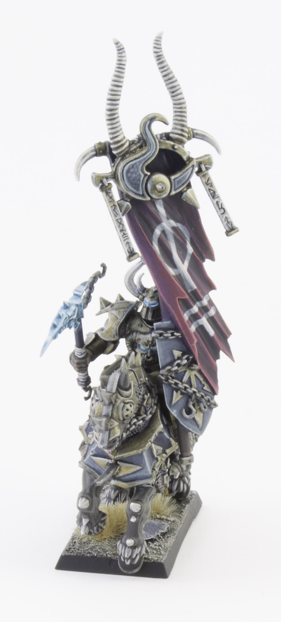 The Standard Bearer is a personal favourite of mine. Once again I used a bright magenta to mark out the command group models and used a converted icon of Tzeentch from a 40K Chaos Space Marine kit. To paint the War Steed I blocked in the skin areas with Charandon Granite and washed it back with Drakenhof Nightshade. Mid tones were picked out in the base colour and then hightlighted with glazes of Stormvermin Fur followed by a thin edge highlight of Baneblade Brown. The longer hair was highlighted with Rackarth Flesh and Pallid Wych Flesh instead.