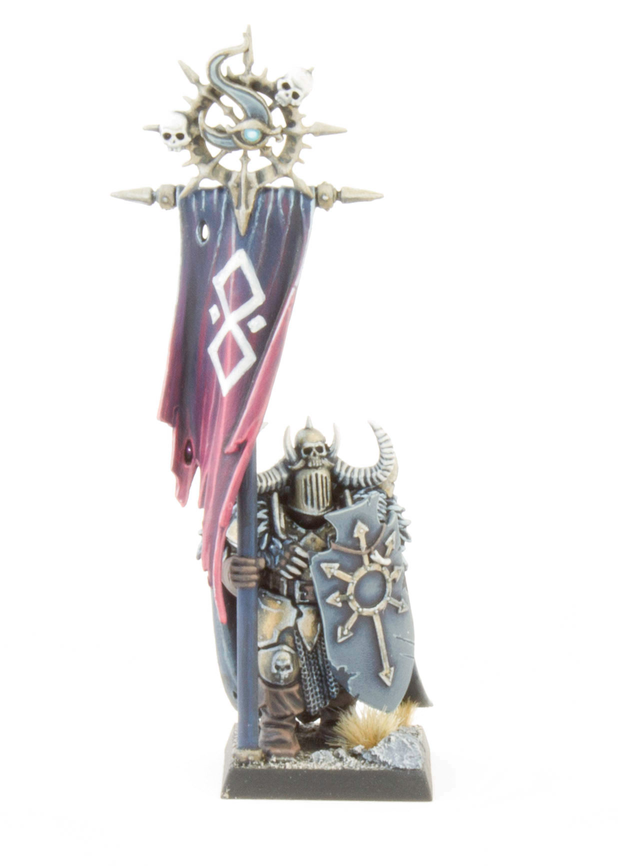 The freehand on the banner was inspired by the runes found on the Chaos Chariot and Chaos Warshrine kits. I wanted to use this to tie together different parts of the army. I use runes and apotropaic symbols on my models to convey the fickle aura of sorcery surrounding those that bear the Mark of Tzeentch.